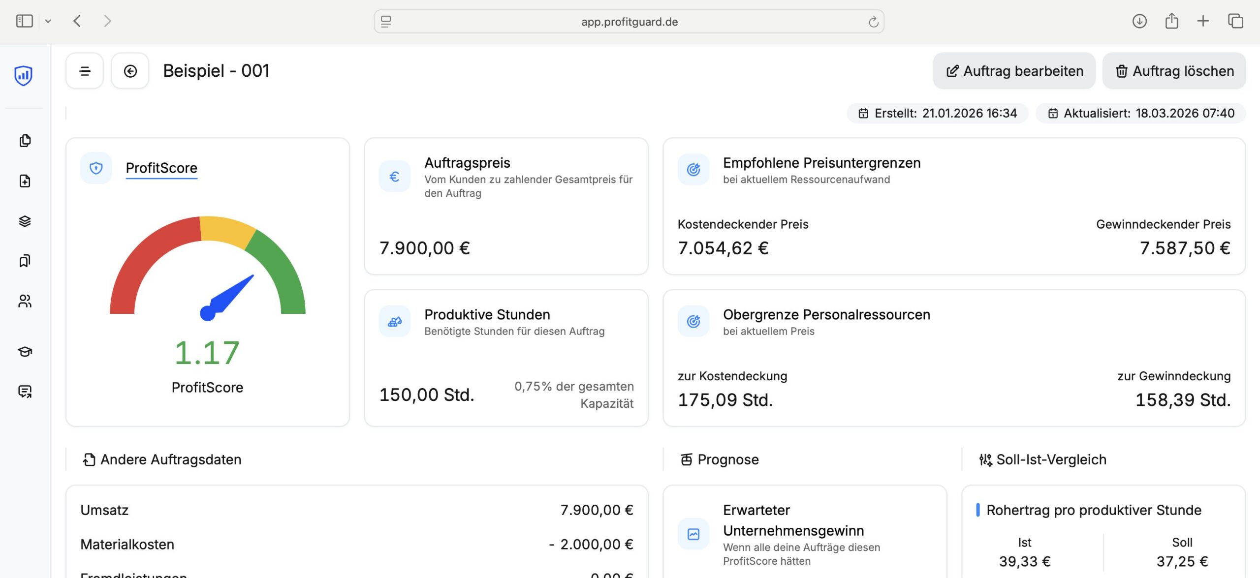 "ProfitGuard zeigt in einer einzigen Kennzahl klar, ob sich ein Auftrag wirklich lohnt, indem Deckungsbeitrag und Ressourceneinsatz transparent und praxisnah bewertet werden."